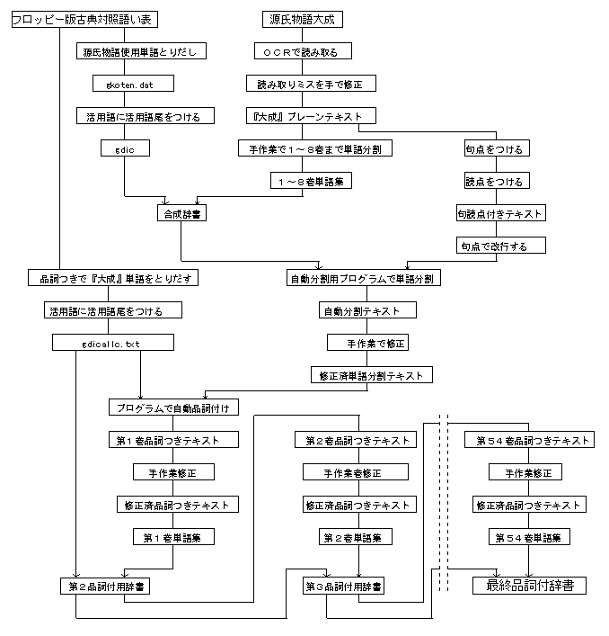 次に、『語い表』から採った『大成』単語集の活用する単語すべてに活用形をつけ、更に助動詞もすべての活用形を含めて追加した。この活用形を追加した『語い表』による『大成』単語集と、手作業分割による1〜8巻までの単語集とを合成した辞書を作成した。その単語集を小文字数からアイウエオ順に並び変え、最初の自動単語分割用辞書とした。この時一文字の単語は、分割が不正確になりやすいので削除し、二文字の単語から収録した。