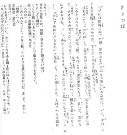 | /いつれ/の/御時/に/か/。/女御/・/更衣/あまた/さふらひ/給/ける/なか/に/、/いと/、/やむことなき/きは/に/は/あら/ぬ/か/、/すくれ/て/時めき/給/あり/けり。/はしめ/より/、/我/は/と/、/思あかり/給へ/る/御方¥/、/めさましき/もの/に/おとしめ/そねみ/給/。/おなし/ほと/、/それ/より/下らう/の/更衣たち/は/、/まして/、/やすからす/。/あさゆふ/の/宮つかへ/に/つけ/て/も/、/人/の/心/を/のみ/うこかし/、/うらみ/を/おふ/つもり/に/や/あり/けむ/、/いと/、/あつしく/なりゆき/、/もの心ほそけに/さとかちなる/を/、/いよ¥¥/あか/す/あはれなる/物/に/おもほし/て/、/人/の/そしり/を/も/、/え/はゝから/せ/給は/す/、/世のためし/に/も/なり/ぬ/へき/御もてなし/也/。/かんたちめ/・/うへ人/なと/も/、/あいなく/、/め/を/そはめ/つゝ/、/いと/、/まはゆき/、/人/の/御おほえ/なり/。/もろこし/に/も/、/かゝる/、/こと/の/おこり/に/こそ/、/世/も/みたれ/あしかり/けれ/と/、/やう¥¥/、/あめのした/に/も/、/あちきなう/、/人/の/もてなやみくさ/に/なり/て/、/楊貴妃/の/ためし/も/、/ひきいて/つ/へく/なりゆく/に/、/いと/、/はしたなき/こと/おほかれ/と/、/かたしけなき/御心はへ/の/、/たくひなき/を/たのみ/に/て/、/ましらひ/給/。/ちゝ/の/大納言/は/なくなり/て/、/はゝ/北の方/なん/、/いにしへ/の/、/人/の/よし/ある/にて/、/おや/うちくし/、/さしあたりて/世/の/おほえ/はなやかなる/御方¥/に/も/いたう/おとら/す/、/なにこと/の/ |